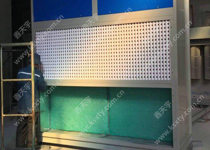 干式噴漆房是一種采用折流板、濾網等干式過濾器過濾漆霧的設備,抽風方式為橫向抽風,一般為死端式或臺式。在通風機的作用下漆霧進入過濾器被粘附捕集,除去了漆霧的空氣,經通風管,排至車間之外。